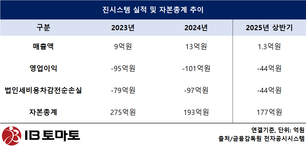 진시스템 관계자는 <IB토마토>와의 통화에서 "매출액 요건의 경우 올해까지는 괜찮고, 내년부터 그 부분을 염두에 두고 비즈니스를 진행해야되는데 매출 요건에 대한 대안이나 방안들은 다 구상을 하고 있다"며 "저희는 현재 추진하고 있는 비즈니스가 원활히 진행되면 예상대로 매출이 발생할 것이라고 생각하고 있기 때문에 매출 요건과 관련해서는 특별히 우려하고 있지 않다"고 말했다.