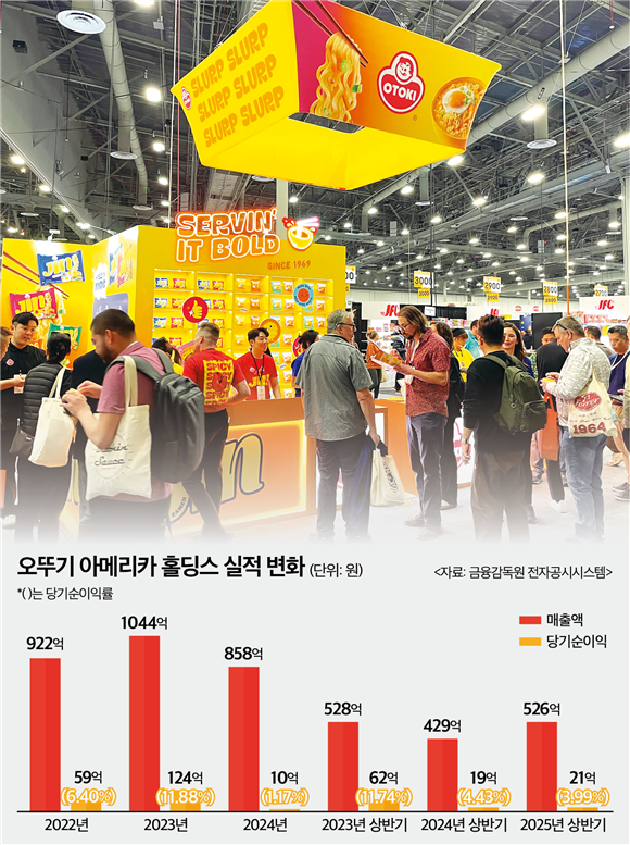 하지만 오뚜기와 농심의 미국 법인은 부진을 겪고 있다. 농심은 지난해 상반기 3088억원에 이르던 매출액이 올해 반기 3049억원으로 소폭 감소했다. 관세 영향으로 북미 간 수출이 축소된 영향이다. 농심의 미국향 매출은 지난 2022년 5613억원에서 2023년 6198억원으로 크게 늘어난 이후 지난해 6206억원으로 성장이 둔화됐다.