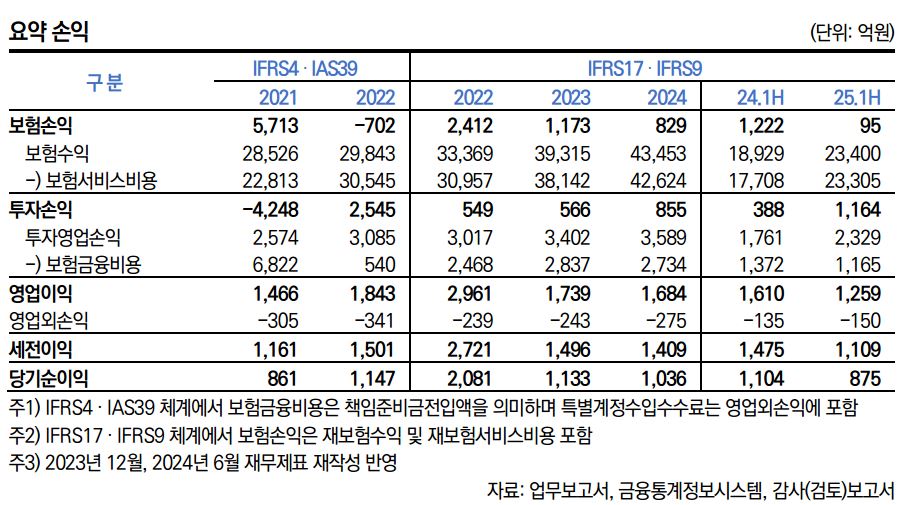 다만 자본적정성은 지급여력비율 하락으로 다소 저하된 상황이다. 지급여력비율은 경과조치 후 기준 2023년 말 316.8%에서 2024년 말 201.6%, 올해 상반기 164.2%로 저하되는 추세다. 경과조치란 보험사가 새로운 지급여력제도(K-ICS)에 연착륙할 수 있도록 가용자본이나 위험액 등을 유예하거나 감안하여 평가하는 방식을 말한다.