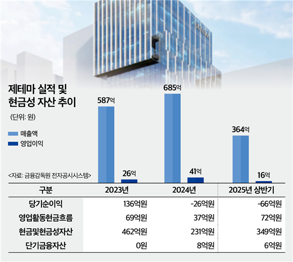 최근 제테마의 매출은 2022년 460억원에서 2023년 587억원, 2024년 685억원으로 증가해 왔다. 다만 2021년부터 3년간 당기순이익 흑자를 이어오다 지난해 26억원의 당기순손실을 기록하며 적자 전환했다. 올해 상반기에도 66억원 규모의 순손실을 이어가는 중이다.