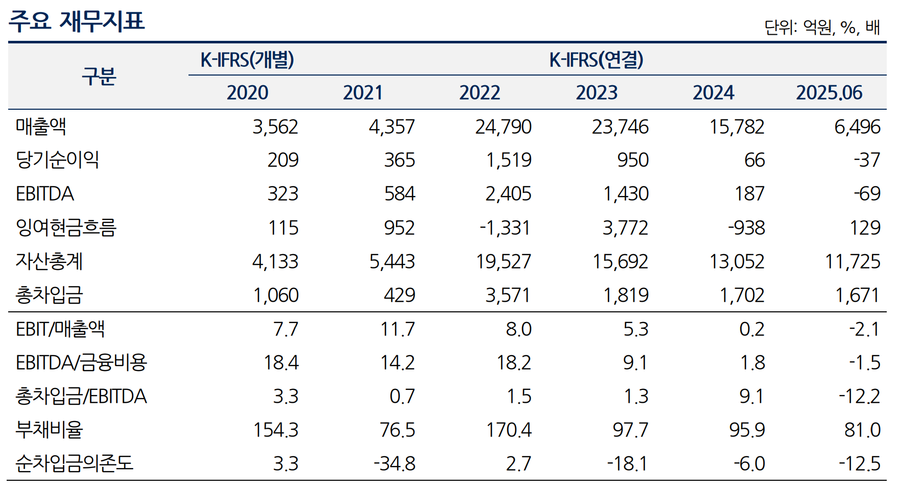 이에 지난 2023년 연결 기준 1266억원에 이르던 영업이익은 2024년 24억원으로 급감한 이후 올해 상반기에는 133억원 적자를 기록했다. 향후 진행사업장의 예정원가율과 준공일정 등을 고려하면 단기적으로 주택개발부문의 영업수익성은 저하된 수준을 지속할 것으로 판단된다.