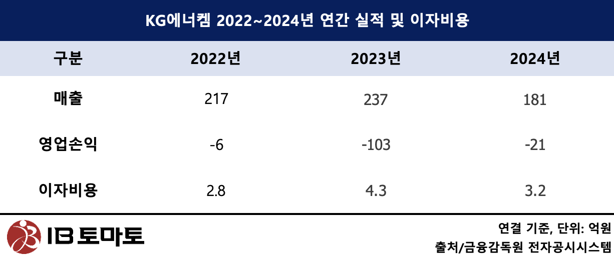 하지만 KG케미칼의 예상과 다르게 회사는 곧 적자 기업이 됐다. KG에너켐은 2021년까지 흑자를 냈지만, 2022년부터 적자로 돌아선 뒤 흑자 전환에 번번이 실패해왔다. 2022년 연간 매출은 217억원, 영업손실 6억원, 2023년 매출 237억원, 영업손실 103억원, 지난해에는 매출 181억원, 영업손실 21억원을 기록했다.