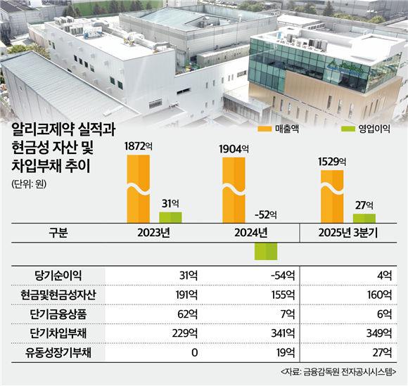 알리코제약(260660)이 1년 만에 또 다시 동일한 규모의 CB에 대한 조기상환청구권(풋옵션) 행사 리스크에 직면했다. 3분기 말 기준 회사는 보유 현금의 2배가 넘는 규모의 차입금 상환 부담을 안고 있어 풋옵션이 현실화될 경우 유동성 압박이 심화될 전망이다. 다만, 사측은 풋옵션 행사에 대해 준비하고 있고, 차입금의 경우 만기 연장과 분할 상환이 이뤄지고 있다며 유동성엔 문제가 없다는 입장을 밝혔다.