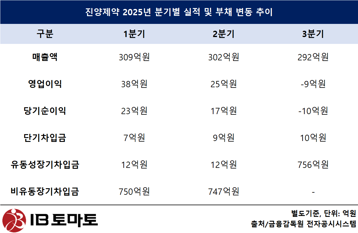 문제는 올 들어 진양제약의 수익성이 악화되며 끝내 적자로 접어들었다는 점이다. 회사의 2025년도 분기별 영업이익률은 1분기 12.43%에서 2분기 8.20%로 떨어지더니 3분기 -3.21%를 기록했으며, 3분기 누적 영업활동현금흐름은 49억원으로 전년 동기 149억원 대비 100억원 감소했다.