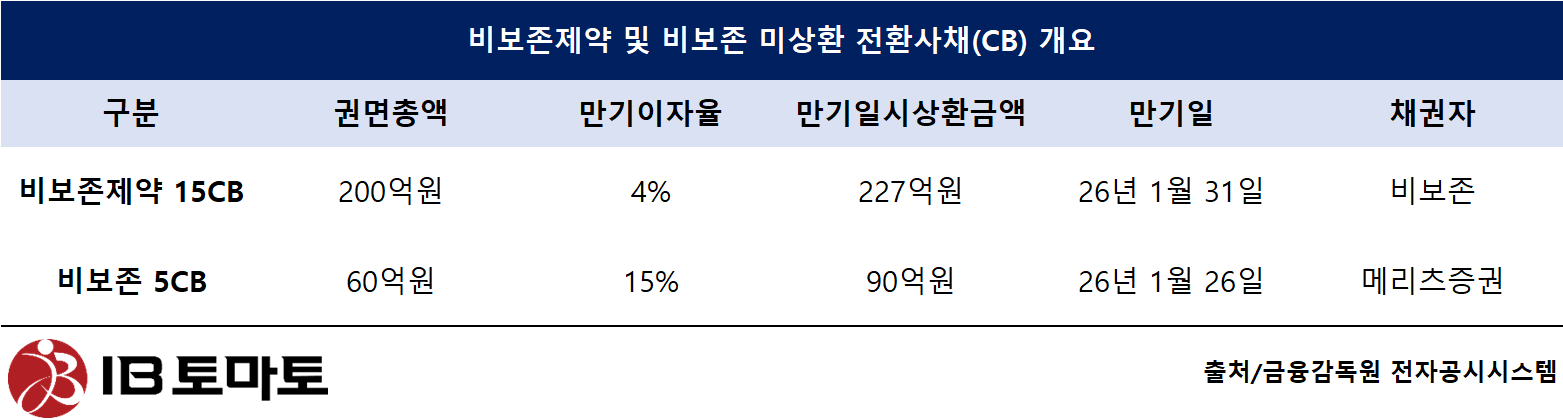 문제는 비보존 쪽 사정이다. 비보존제약이 비보존에 15회차 CB를 상환하고 나면 비보존은 지난 2023년 메리츠증권을 대상으로 발행했던 60억원 규모의 5회차 CB를 전액 상환할 예정이다.