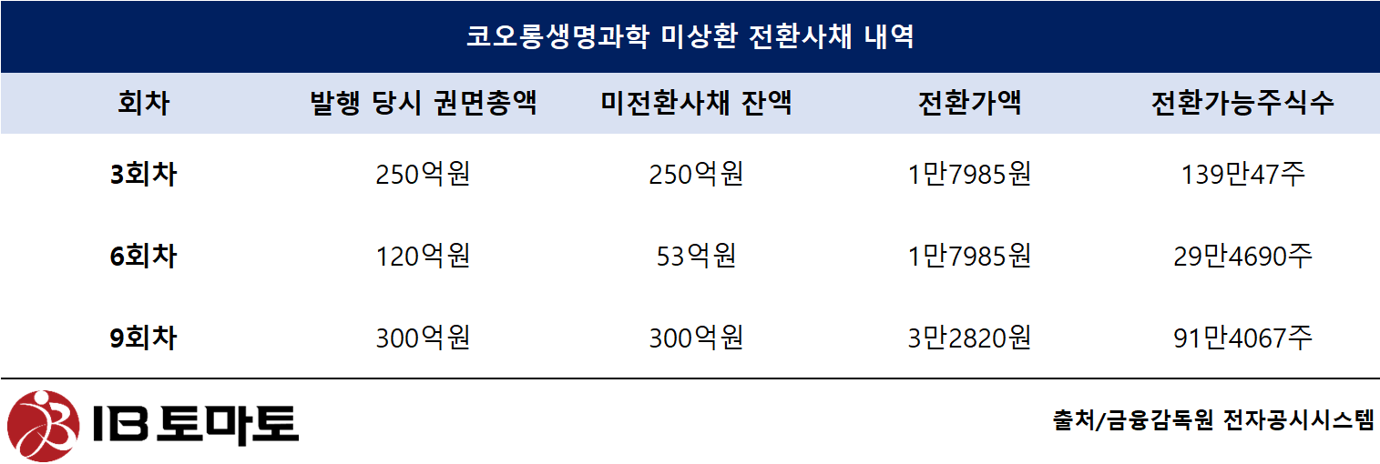 현재 코오롱생명과학은 지난 2021년 발행한 3회차 CB도 미상환 상태로 보유 중인데, 해당 CB의 전환가액 역시 1만7985원인 상태다. 3회차 CB의 경우 만기가 2051년으로 영구전환사채로 분류되지만, 전환권 자체는 정해진 기간 내 행사가 가능하다. 전환청구기간의 시작일은 2022년 12월10일이었다.