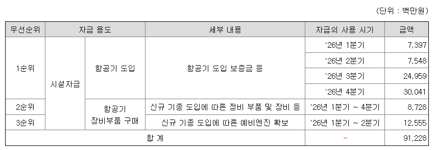 항공기 도입 보증금을 가장 우선순위로 두며, 부품 장비 확보가 2순위, 예비 엔진 확보가 3순위다. 유상증자로 자금을 마련해 대한항공에서 임대한 A330-200 기종을 대체할 계획이다. 이 경우 좌석 수 37%가 증가하며, 연료 소모량은 14% 개선된다. 이 외에도 소형 기종은 연료 효율성이 17% 향상된 항공기로 바꾸기로 했다.