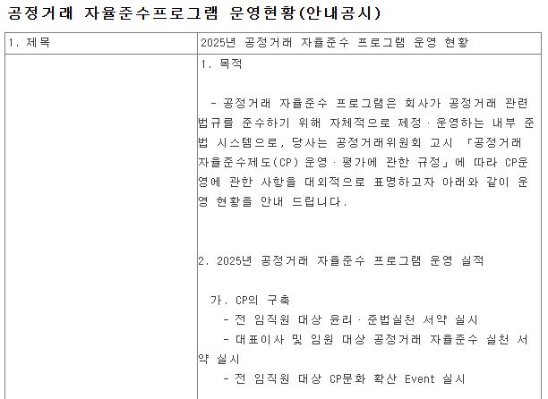실제 운영 단계에서는 공정거래법규 관련 위험성 평가를 실시하고, 사전업무 협의제도와 제보 시스템을 상시 운영했다. 아울러 컴플라이언스 활동 참여자에게 인센티브를 제공하고, CP 우수부서를 선정해 포상하는 등 내부 유인책도 마련했다.