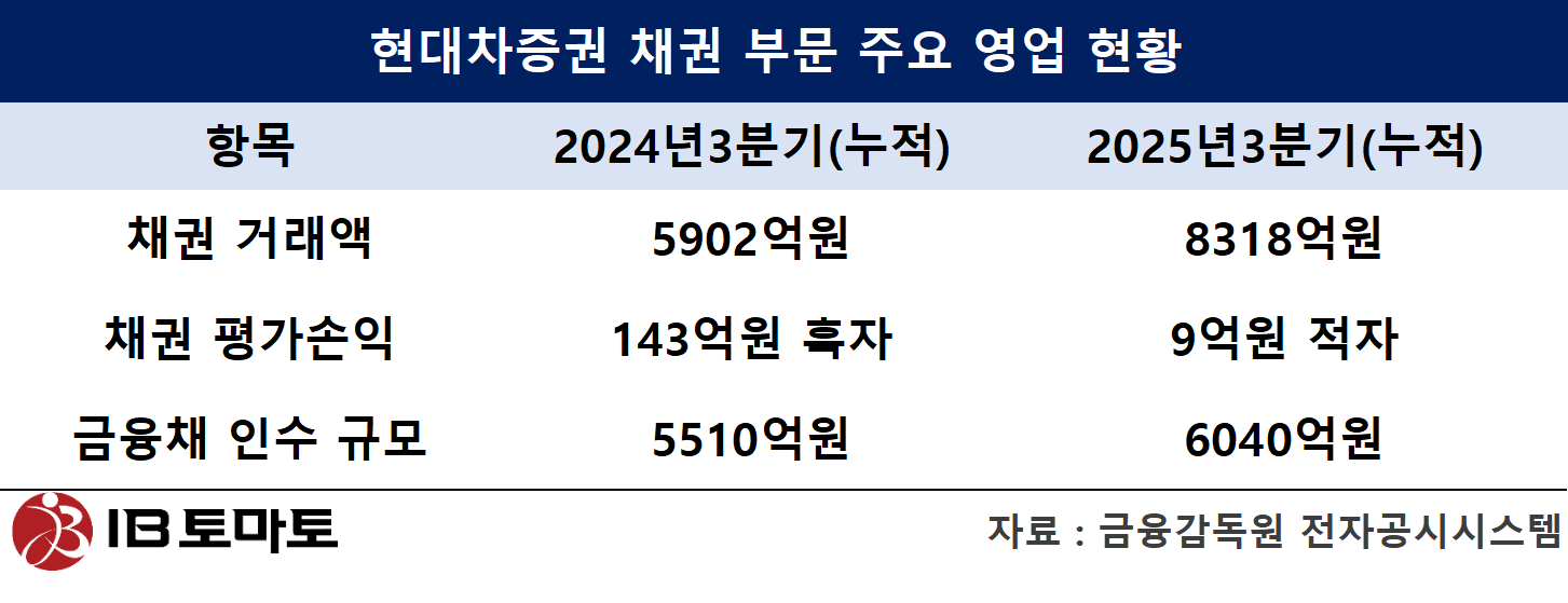 현대차증권의 올해 3분기까지 누적 채권 거래 규모는 8318억원이다. 이는 작년 3분기까지 기록한 5902억원 대비 40.9% 증가한 수준이다. 현대차증권은 그간 퇴직연금과 부동산 프로젝트 파이낸싱에 치중된 사업 포트폴리오를 채권 운용을 확대하는 방향으로 전환을 이어왔다.