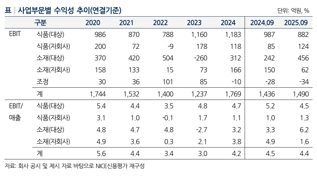 수익성 측면에서도 2025년 들어 경기침체에 따른 전반적인 소비 감소 및 원가 인상으로 국내 식품 부문의 수익성이 저하됐으나, 라이신 부문의 상반기 실적 호조와 해외 식품 매출의 증가에 힘입어 2025년 3분기 영업이익은 전년 동분기 대비 54억원 증가한 1490억원을 기록했다.