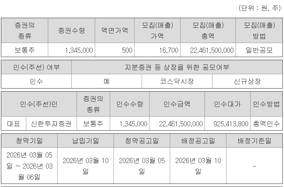 주관사인 신한투자증권은 상대가치법 가운데 주가수익비율(PER) 비교 방식을 적용해 공모가액을 산정했다. PER은 기업의 주가와 주당순이익(EPS)의 관계를 나타내는 지표로 영업활동을 통한 수익력과 성장성, 사업 리스크에 대한 시장의 평가가 종합적으로 반영된다.