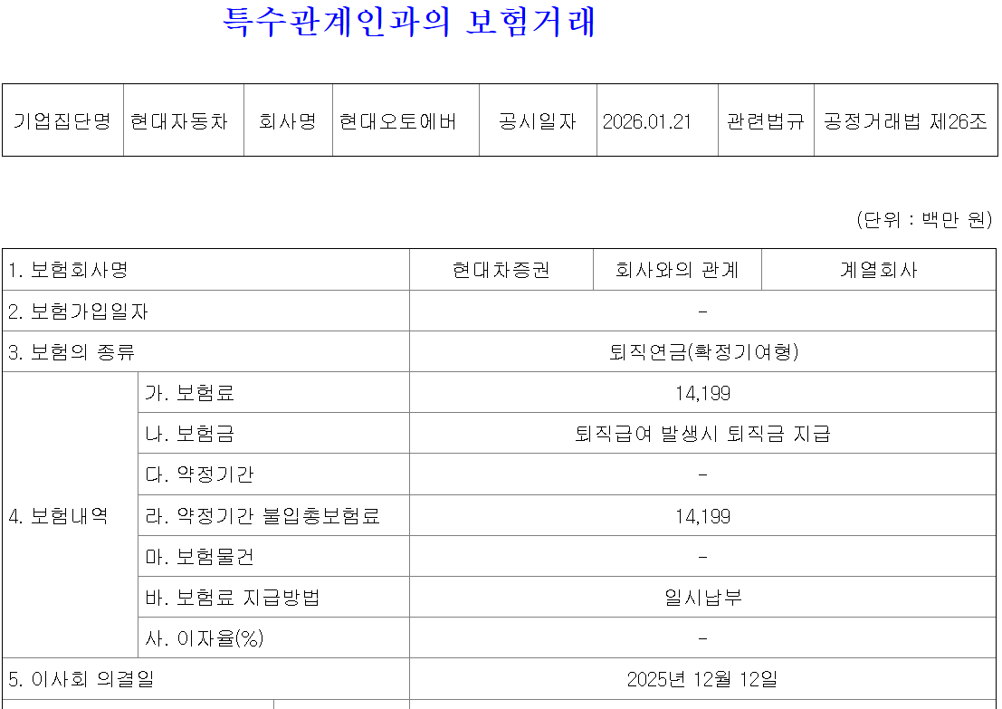 현대오토에버(307950)는 ‘특수관계인과의 보험거래’ 공시를 냈다. 거래 상대방은 같은 현대자동차그룹 계열회사인
