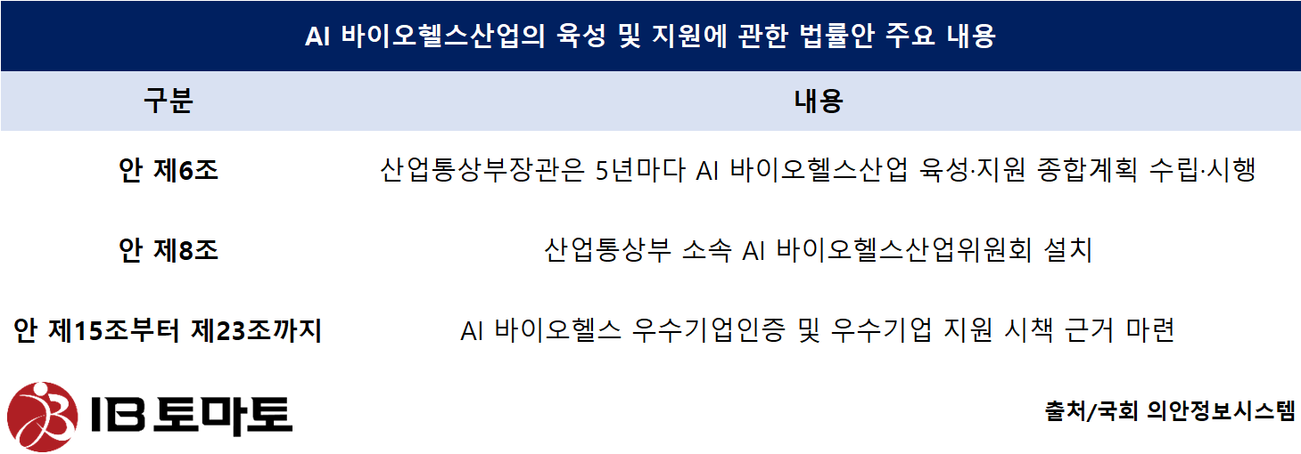 우선 산업통상부 장관으로 하여금 관계 중앙행정기관 장과 협의를 거쳐 'AI 바이오헬스산업의 육성·지원 종합계획'을 5년마다 수립·시행토록 했으며, 산업 기술 육성 및 지원과 관련 사항 심의하기 위한 산자부 소속 AI 바이오헬스산업위원회를 설치하도록 했다.