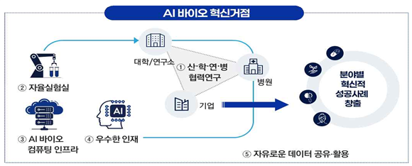 정부가 마련한 국가전략에 따르면 기업, 대학·연구소, 병원 등 산·학·연·병이 함께하는 AI 바이오 혁신 연구거점이 조성된다. 정부는 연내 합성신약 분야 1개 시범거점 조성을 시작으로 2027년부터는 2개 이상의 분야로 거점을 본격 확대한다는 계획이다. 각각의 거점에는 AI 바이오 R&D(연구·개발)와 더불어 대규모 AI 바이오 모델 개발에 필요한 컴퓨팅 인프라 및 AI·로봇 기반 고속 실험·검증 인프라 구축이 지원된다.