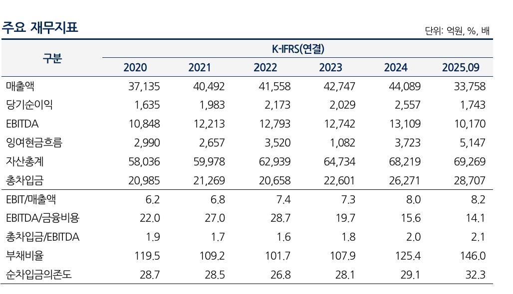 지난해 4분기 희망퇴직을 실시해 일회성 비용이 발생한 것은 부담 요인으로 작용하나, 고단가 고객 비중 확대 등으로 영업수익성은 유지될 전망이다. 또한 업계 2위 경쟁력을 유지하기 위해 망투자 등 높은 설비투자부담이 존재한다. 다만 이를 상회하는 EBITDA 창출로 안정적인 잉여현금흐름이 흑자를 유지할 것으로 예상된다. 2022년부터 2024년까지 회사의 평균 영업현금흐름은 1조 2000억원이다. 지난해 9월 말 부채비율도 146%, 순차입금의존도는 32.3%로 재무체력도 건전한 수준이다.