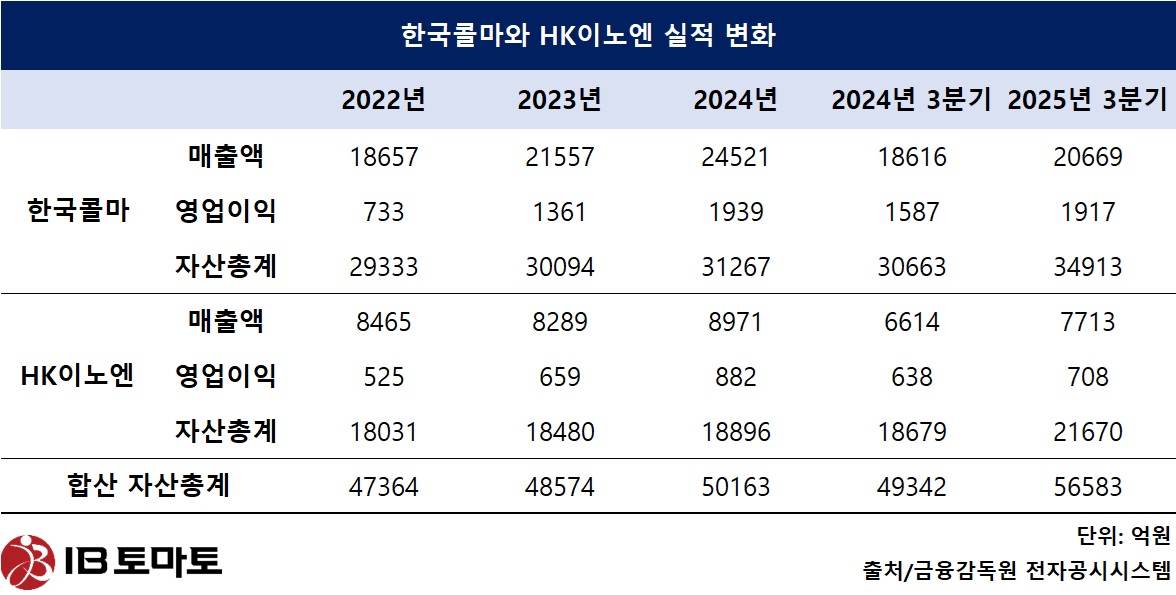 지난해 3분기 말 기준으로 이미 한국콜마와 HK이노엔의 자산총계는 각각 3조 4913억원, 2조 1670억원으로 5조 6583억원을 기록했다. 지난 2024년 말 한국콜마(3조 1267억원), HK이노엔(1조 8896억원) 대비 각각 11.66%, 14.68% 증가한 수치다.