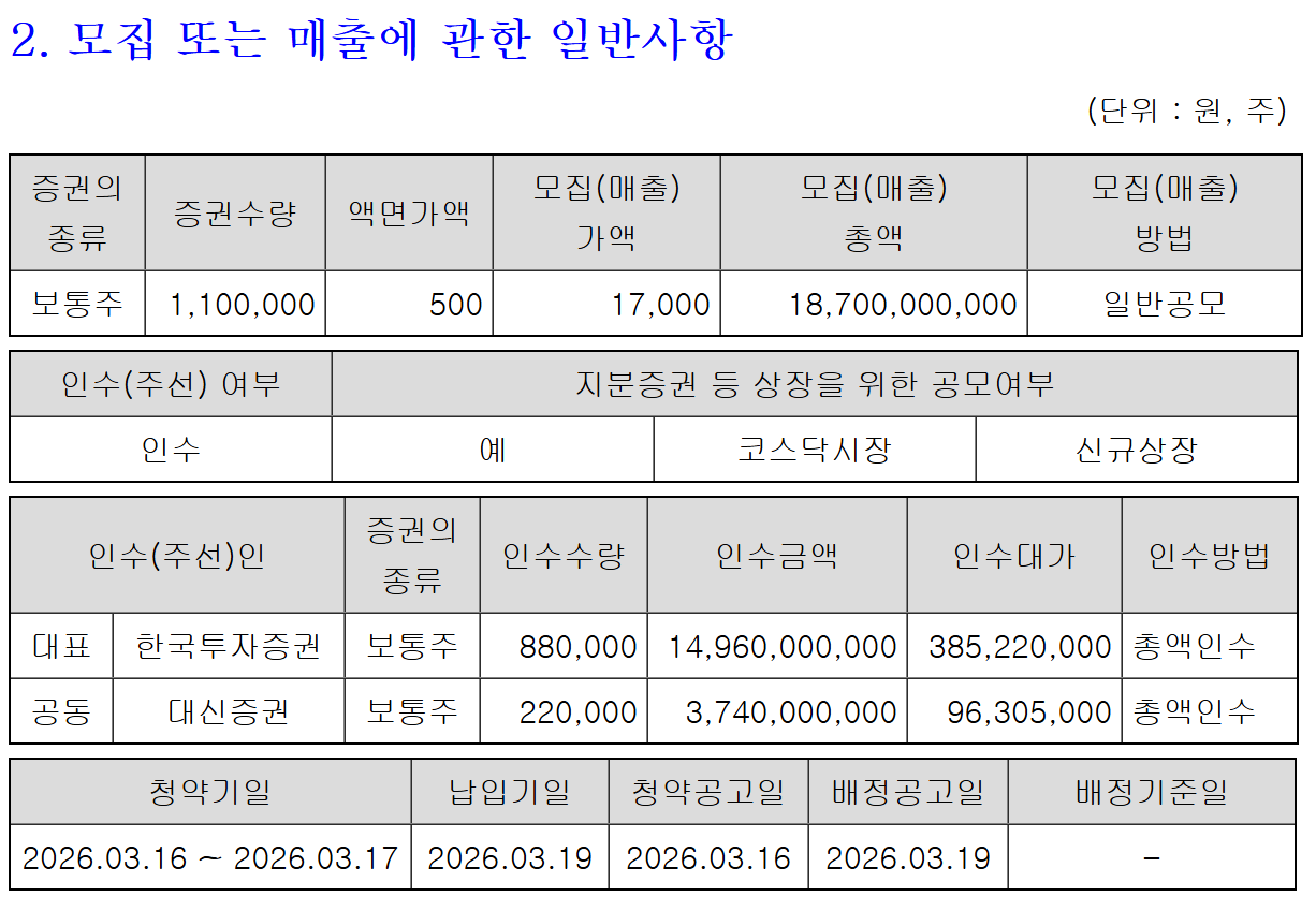 대신증권(003540)이 맡는다. 청약기일은 오는 3월16일부터 이틀간 진행되며, 납입기일은 같은 달 19일이다.