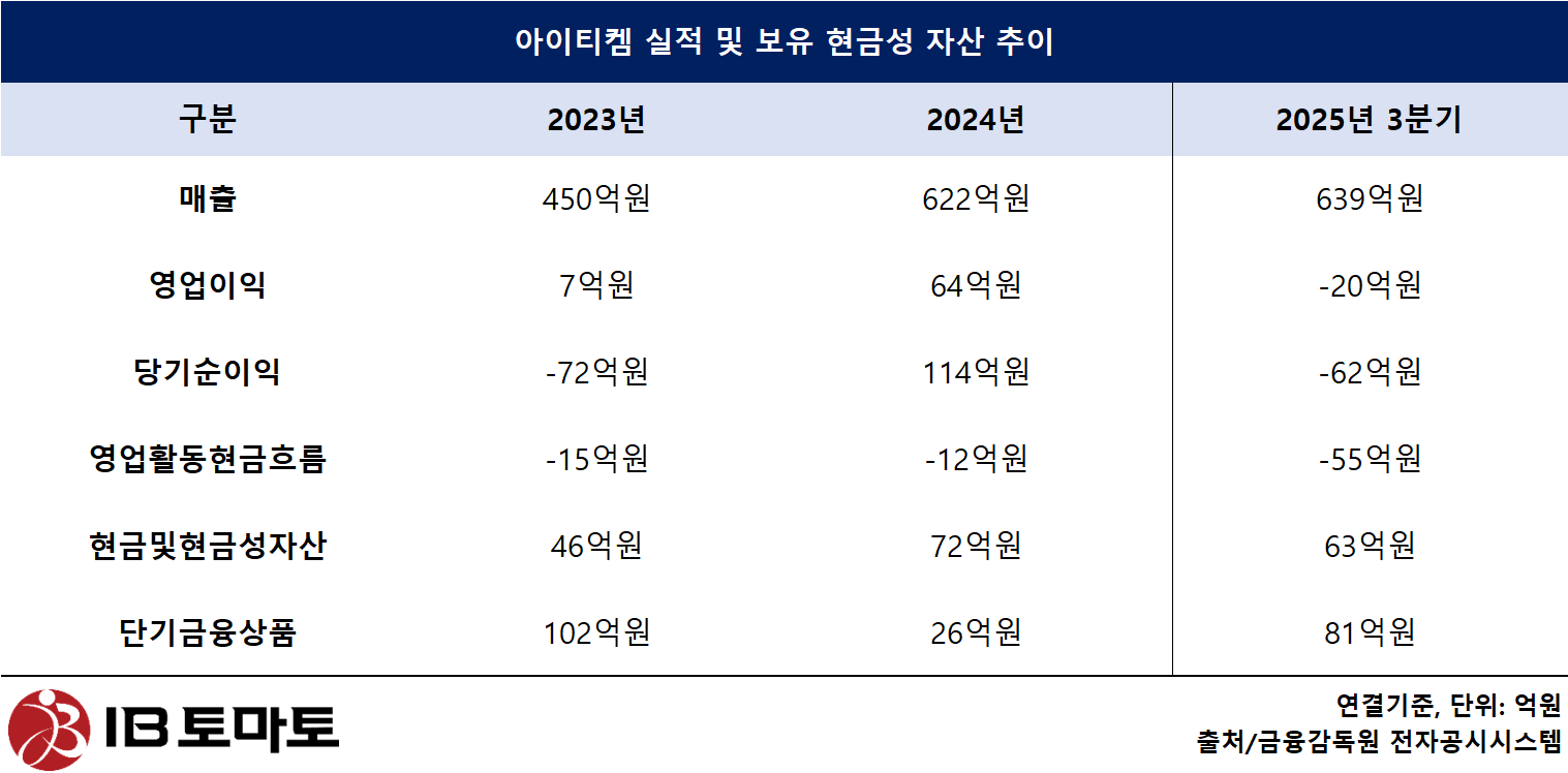 문제는 3분기 말 기준 현금및현금성자산 63억원, 단기금융상품 81억원 등 아이티켐의 보유 현금성 자산이 총 144억원 남짓이라는 점이다. 실제로 공모자금 유입 이전인 2025년 반기 말 보유 현금성 자산 127억원에 미사용 자금 57억원을 더하고, 3분기 순손실 38억원을 감산하면 얼추 계산이 맞아 떨어진다.