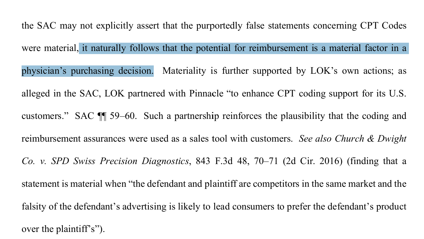 공개된 의견서를 살펴보면 법원은 주요 쟁점인 허위 광고 및 불공정 경쟁에 대한 청구와 관련해 보험 코드가 판매에 영향을 미치는 중대성을 인정했다. 법원은 "소장에서는 CPT 코드 관련 허위 진술이 중대하다고 명시적으로 표현하고 있지는 않지만, 보험 상환 가능성이 의사의 장비 구매 결정에 있어서 중요한 요소라는 점이 자연스럽게 도출된다"고 언급했다.