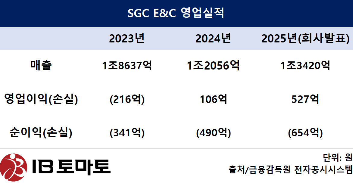 영업 부문의 가파른 성장에도 불구하고 순이익 지표는 악화됐다. 지난해 SGC E&C의 순손실은 전년 대비 33.3% 늘어난 654억원이다. 과거 회사가 수주했던 프로젝트에서 발생한 미수채권의 손상 처리가 손실 증가에 영향을 미쳤다. 건설업 특성상 프로젝트 종료 시점에 회수 가능성이 낮아진 미수채권을 선제적으로 손실 반영한 것으로, 단기적으로는 장부상 수익성에 부담으로 작용했다는 분석이다.