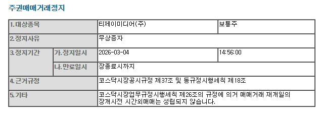 다만 TJ미디어의 경우는 이러한 부정적 사유와는 결이 다르다. 이번 거래 정지는 무상증자 공시에 따른 절차적 조치다.