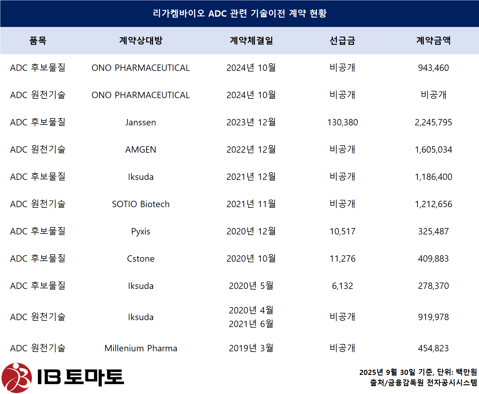지난해 3분기 보고서에 기재된 라이센스 아웃 현황에 따르면 회사는 2019년 3월 일본 다케다의 자회사인 밀레니엄 파마와 4548억원 규모의 ADC 원천기술 기술이전 계약을 시작으로 2024년 10월 일본 오노약품공업과 체결한 9435억원 규모의 ADC 후보물질 기술이전 계약까지 2025년을 제외하고 매년 1건 이상의 ADC 관련 기술 수출을 성사시켰다. 이로써 지난 6년간 회사가 체결한 ADC 기술이전 계약의 규모만 무려 9조 5820억원에 육박한다.