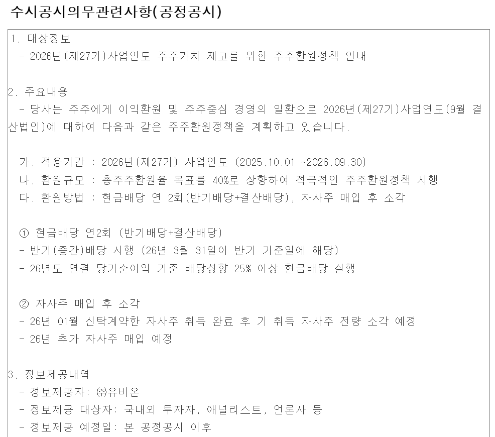 유비온(084440)은 이날 '수시공시의무관련사항(공정공시)'이라는 제목의 공시를 통해 2026년 사업연도 주주가치 제고를 위한 주주환원정책 정보를 안내했다. 회사는 연내 총주주환원율 목표를 40%로 상향해 적극적인 주주환원정책을 시행한다고 밝혔다.