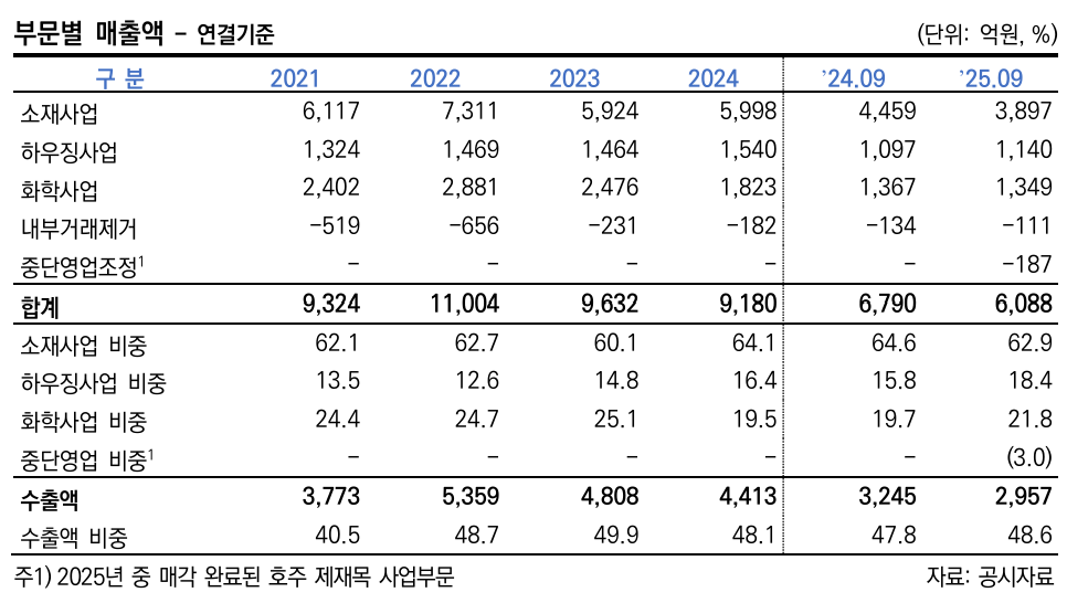 2025년에는 입주물량 감소폭 확대, MDF(Medium Density Fiberboard, 중밀도섬유판) 2공장 폐쇄에 따른 판매량 감소 및 호주 제재목 법인 매각에 따른 187억원 규모의 매출 중단사업 분류 등으로 외형이 재차 감소, 3분기 누적 매출액은 3897억원으로 전년 동기 4459억원 대비 12.60% 줄어든 상태다.