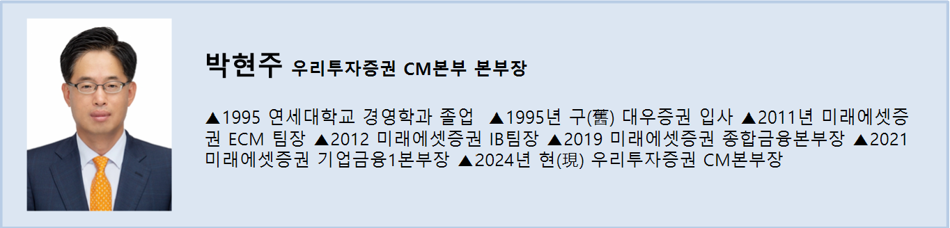 △우리투자증권에서 캐피탈마켓(CM)본부를 이끌고 있다. 우리투자증권 CM본부는 회사채, 유상증자, 구조화 등 기업금융업무 전반을 담당하는 CM1부와 CM2부, 기업공개(IPO)주관과 Pre-IPO를 담당하는 IPO부 그리고 신디케이션 및 세일즈 전담 조직인 CM 솔루션부 등 총 4개 부서로 구성되어 있다. 4개 부서 모두 2024년 우리투자증권 출범 이후 새롭게 신설된 조직이다. 각 부서장들 역시 모두 대형사 출신의 경험 많고 유능한 인재들로 구성돼 있고 사업 안착과 더불어 추가 확장을 준비 중이다.