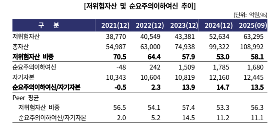 지난해 3분기 IBK투자증권의 요주의이하여신은 2275억원이다. 전년 말 2228억원 대비 확대됐다. 이 중 부동산PF 관련 여신 규모는 2081억원으로, 우발채무 1400억원, 대출채권 681억원으로 구성됐다. 다만 같은 기간 비교기업 대비 부동산PF 관련 위험노출액(익스포저)의 자기자본 대비 비중은 38.6%로 낮은 편에 속한다. 브릿지론 비중도 14.7%로 높지 않으나 변제 순위상 중 후순위 약정 비중이 76%로 큰 점은 부담이다.