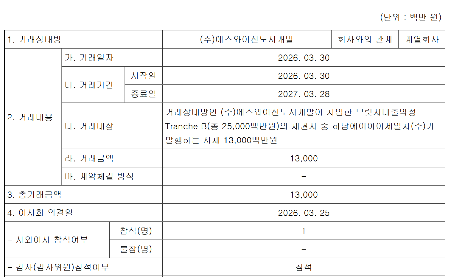 1일 금융감독원 전자공시시스템에 따르면 신영은 특수관계인과의 내부거래 사안 한 건을 공시했다. 계열사인 에스와이신도시개발 차입과 관련된 것이다. 에스와이신도시개발의 브릿지론 약정(트렌치B, 250억원) 채권자 중 하나인 하남에이아이제일차(특수목적법인)가 발행하는 사채 130억원을 신영이 인수하는 내용이다.