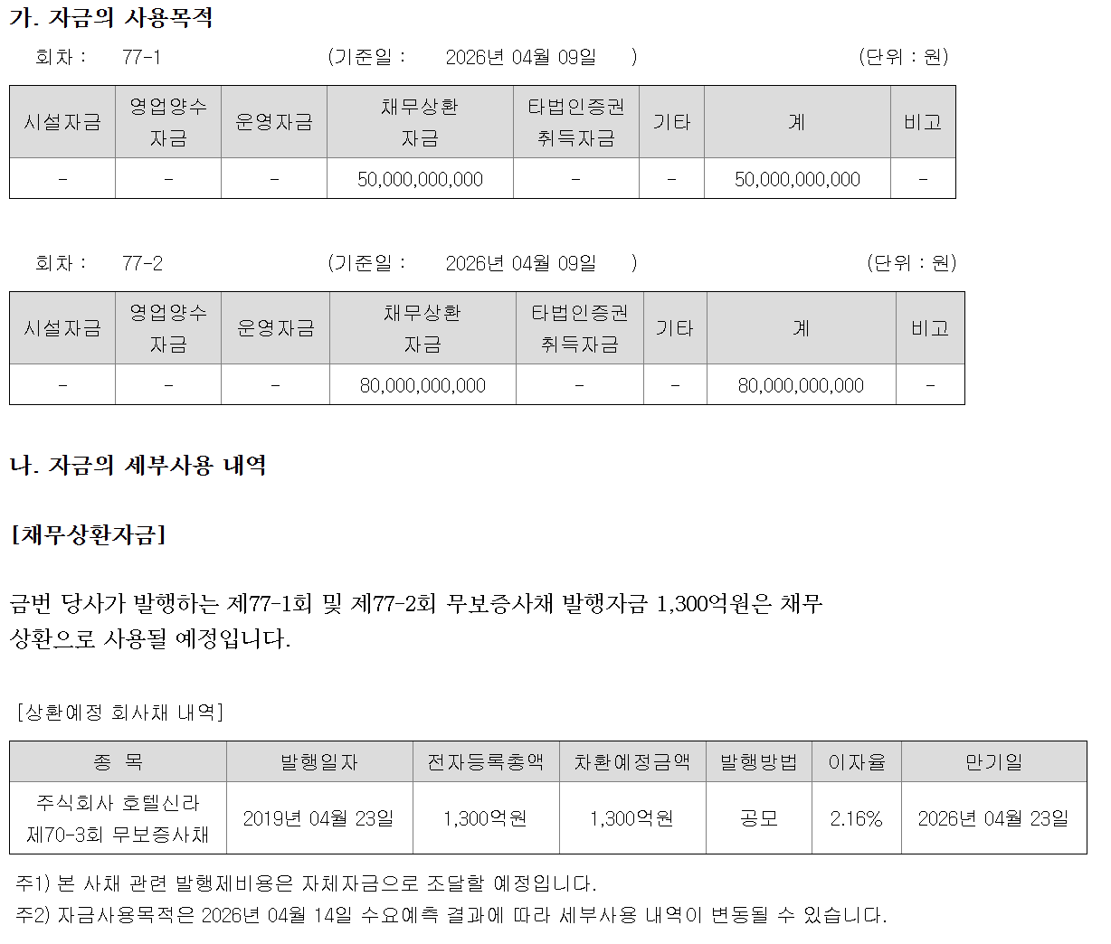 13일 금융감독원 전자공시시스템에 따르면 호텔신라는 제 77-1회 및 77-2회 무기명식 이권부 무보증사채를 발행한다. 만기는 77-1회가 2028년 4월21일, 77-2회가 2029년 4월20일이며 발행규모는 각각 500억원, 800억원으로 예정돼 있다. 주관회사는 한국투자증권,