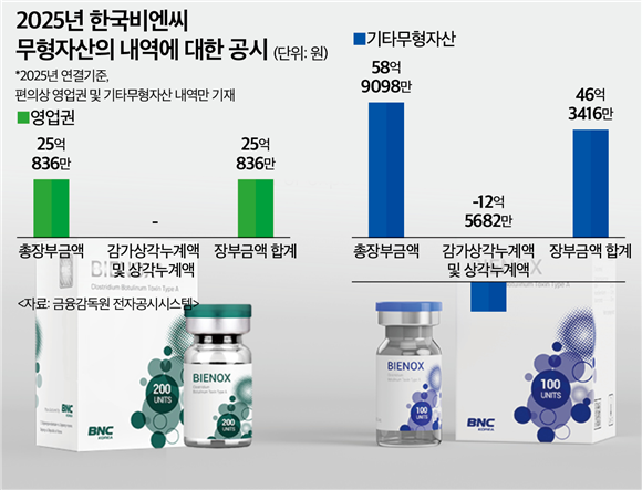 한국비엔씨 관계자는 <IB토마토>와의 통화에서 영업권과 기타무형자산 구분이 애매한 이유에 대해서는 "거래소에서 배포하는 XBRL의 표준 계정을 사용하게 해서 재무제표를 작성하게끔 돼 있다"며 "실질적으로 회사에서 사용하는 계정이랑은 조금은 차이가 있다"고 말했다.