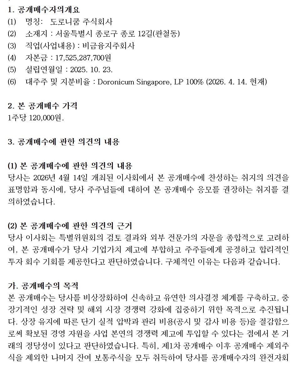 시장에서는 공개매수가 단순한 주식 매입을 넘어 지배구조 재편과 상장폐지까지 이어질 수 있는 거래인 만큼, 공시를 통해 제시되는 가격과 조건뿐 아니라 경영진의 판단과 향후 절차까지 종합적으로 살펴야 한다는 조언이 나온다.