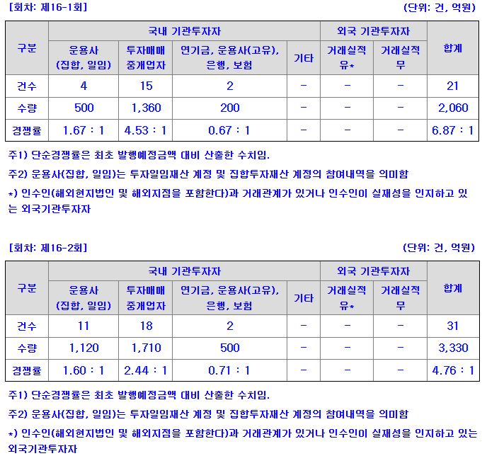 수요예측 결과에 따르면 2년물은 총 21건의 주문이 들어오며 2060억원의 수요를 확보했고, 단순 경쟁률 기준 6.87대 1을 기록했다. 3년물 역시 31건, 3330억원의 주문이 몰리며 약 4배 수준의 경쟁률을 나타냈다. 2년물의 경우 투자매매·중개업자 중심으로 수요가 집중되며 상대적으로 높은 경쟁률을 보였고, 3년물은 운용사와 보험·연기금 등 장기 투자자 수요가 고르게 유입됐다.