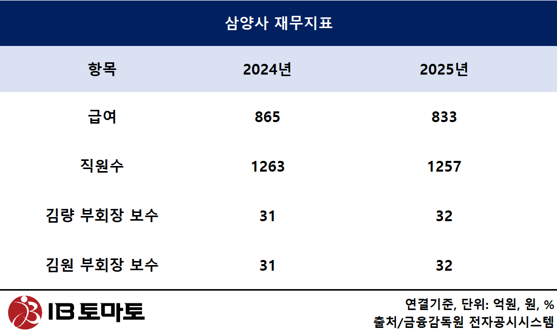 반면 오너 일가 및 경영진 보수는 증가했다. 김량 삼양사 부회장은 2024년 31억원에서 2025년 32억2800만원으로 보수가 늘었고, 김원 부회장도 같은 기간 31억원에서 32억2900만원으로 증가했다.