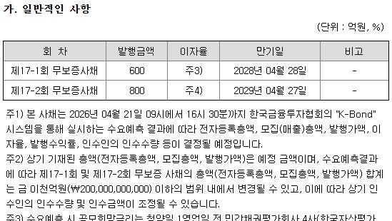 수요예측 결과에 따라 최대 2000억원 범위 내에서 증액 발행이 가능하다. 만기 구조는 2년물과 3년물로 나뉜다. 2년물은 2028년 4월, 3년물은 2029년 4월 만기로 설정됐다. 이자 지급은 3개월 단위다.