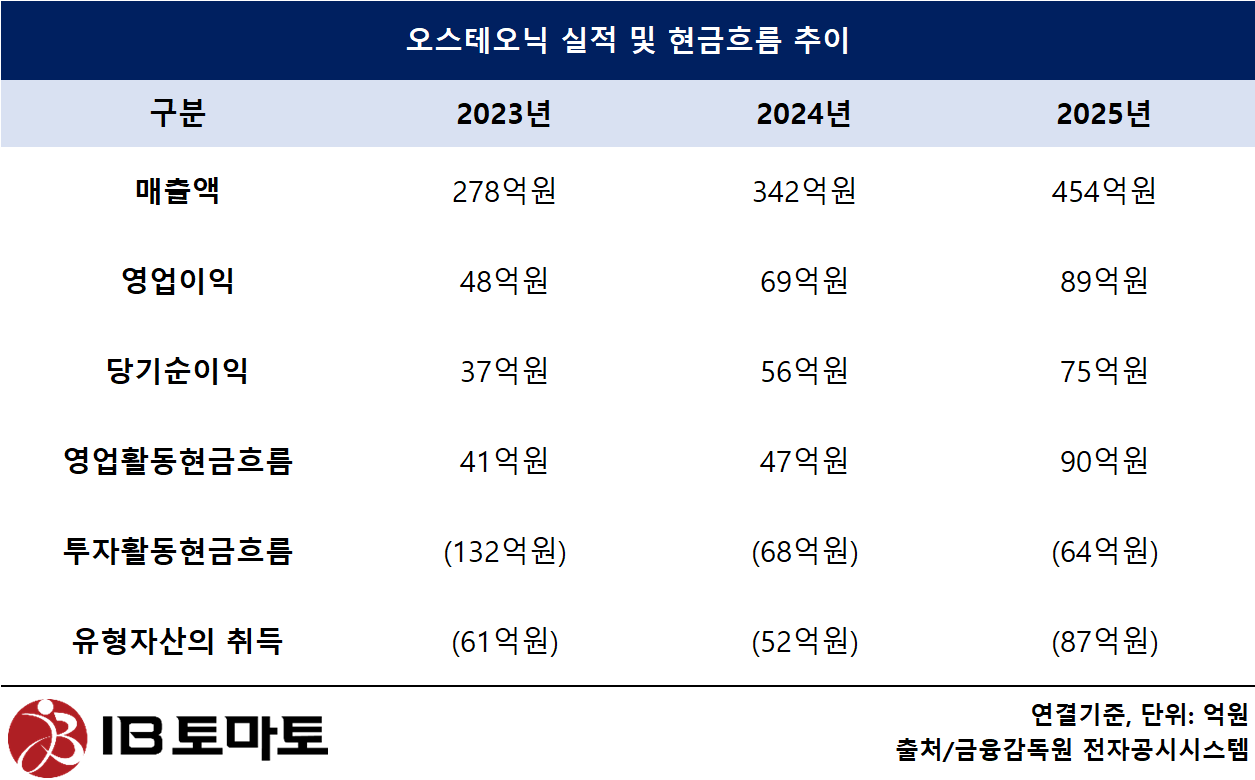 실적 개선 외에도 현금흐름의 선순환 구조가 눈에 띈다. 오스테오닉의 지난해 영업활동현금흐름은 90억원을 기록했는데, 회사는 영업활동으로 인해 벌어들인 현금과 맞먹는 규모의 현금을 시설투자에 재투입한 것으로 보인다. 회사의 투자활동현금흐름 중 '유형자산 취득' 항목은 2023년 61억원에서 2024년 52억원으로 잠시 주춤했지만 지난해 87억원으로 집계되며 다시 증가하는 모습이다.