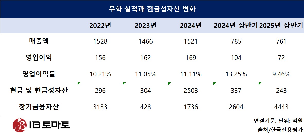 하지만 올해 상반기 재차 매출액과 영업이익이 감소했다. 올 상반기 매출액은 761억원으로 지난해 동기(785억원) 대비 3.06% 줄었다. 영업이익은 104억원에서 72억원으로 30.77% 급감하면서 영업이익률은 9%대로 추락했다. 다만, 올 상반기 말 부채비율과 차입금의존도는 각각 21.4%, 8.7%로 안정적인 수준을 유지했다.