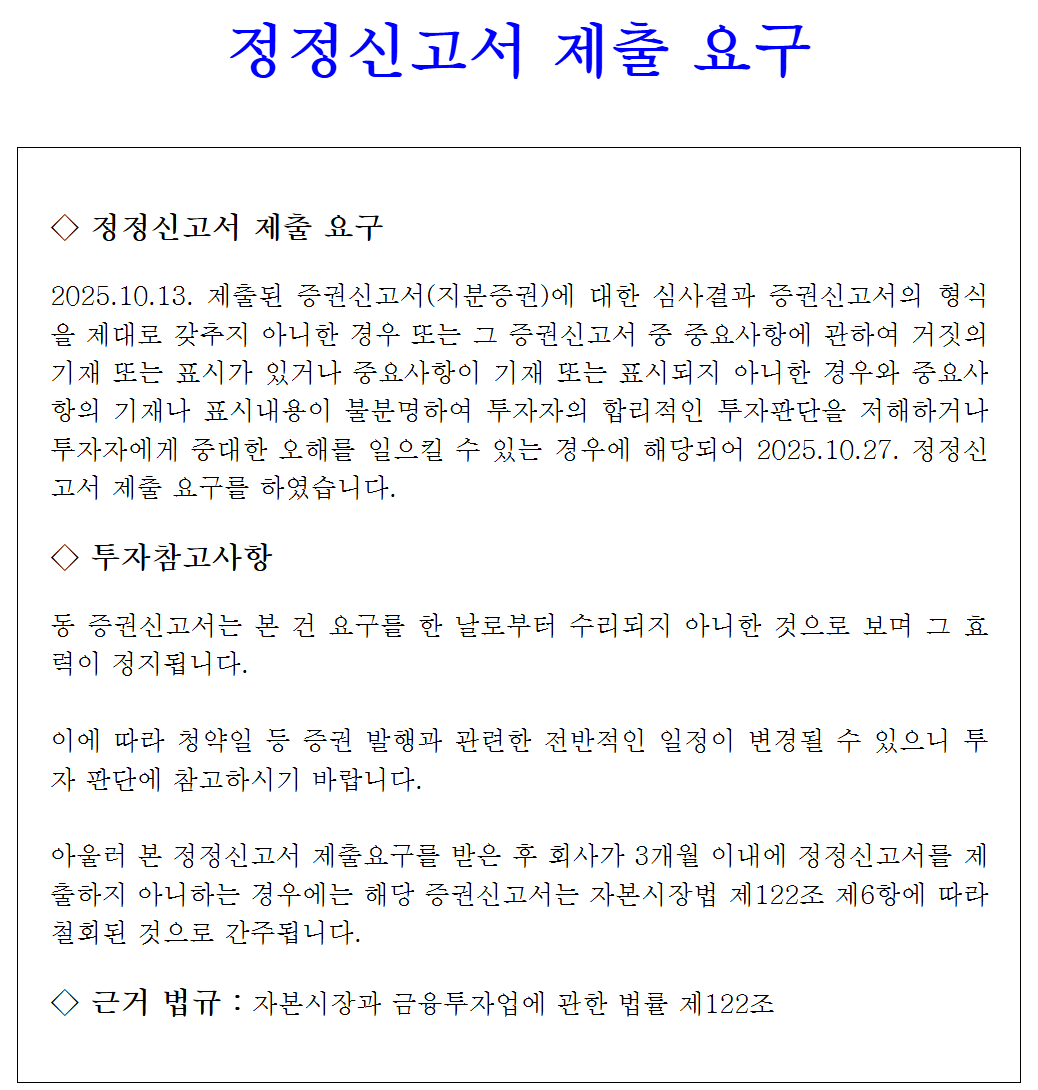 자본시장과 금융투자업에 관한 법률에 따르면 금융위원회는 △증권신고서의 형식을 제대로 갖추지 않은 경우 △증권신고서 중 중요사항에 관하여 거짓의 기재 또는 표시가 있거나 중요사항이 기재 또는 표시되지 않은 경우 △중요사항의 기재나 표시내용이 불분명해 투자자의 합리적인 투자판단을 저해하거나 투자자에게 중대한 오해를 일으킬 수 있는 경우 그 증권신고서에 기재된 증권의 취득 또는 매수의 청약일 전일까지 그 이유를 제시하고, 그 증권신고서의 기재내용을 정정한 신고서의 제출을 요구할 수 있다. 다만 금감원은 이번 공시에서 구체적인 사유를 밝히지는 않았다.