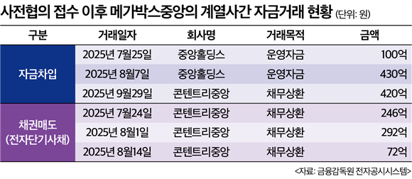구체적으로 보면 지난 7월25일 중앙홀딩스로부터 100억원, 8월7일 430억원을 운영자금 명목으로 차입해왔다. 이어 지난 9월29일에는 채무 상환을 위해 420억원을 콘텐트리중앙에서 자금을 조달받았다. 기존 차입금을 합산한 거래상대방과의 총차입금은 중앙홀딩스 1260억원, 콘텐트리중앙 870억원에 이른다.