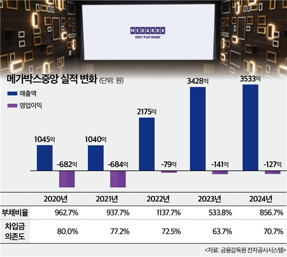 앞서 메가박스중앙은 지난 2020년 코로나19 감염증 팬데믹(세계적 대유행)과 온라인동영상서비스(OTT) 시장 성장으로 인해 재무부담이 지속됐다. 지난 2019년까지 3328억원에 달했던 매출액은 코로나19 확산이 시작된 2020년 1045억원으로 하락했다. 같은기간 영업이익도 390억원에서 -682억원으로 적자전환했다. 급격한 실적 악화 속에서 운영자금을 마련하기 위해 콘텐트리중앙으로부터 차입금을 조달해오면서 메가박스중앙의 부채비율은 962.7%로 급증했다. 차입금의존도 역시 80.0%까지 치솟았다.