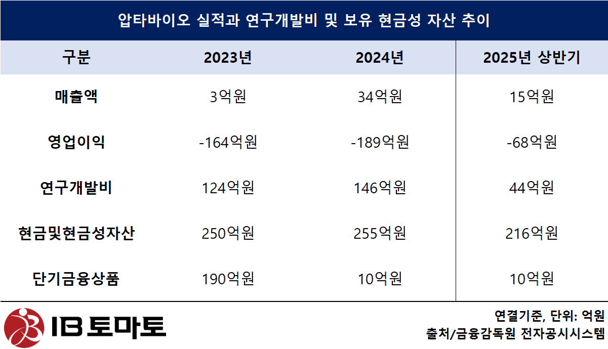 이에 향후 2~3년간 파이프라인 임상 진입 본격화에 따른 연구개발비 증가가 예상된다. 그간 압타바이오의 연구개발비 투입 비용은 매년 몸집을 불려왔다. 연도별로 2022년 62억원에서 2023년 124억원으로 늘었고, 2024년에는 146억원으로 집계됐다. 올해 상반기 들어서는 44억원이 투입되며 다소 주춤하는 모양새다.