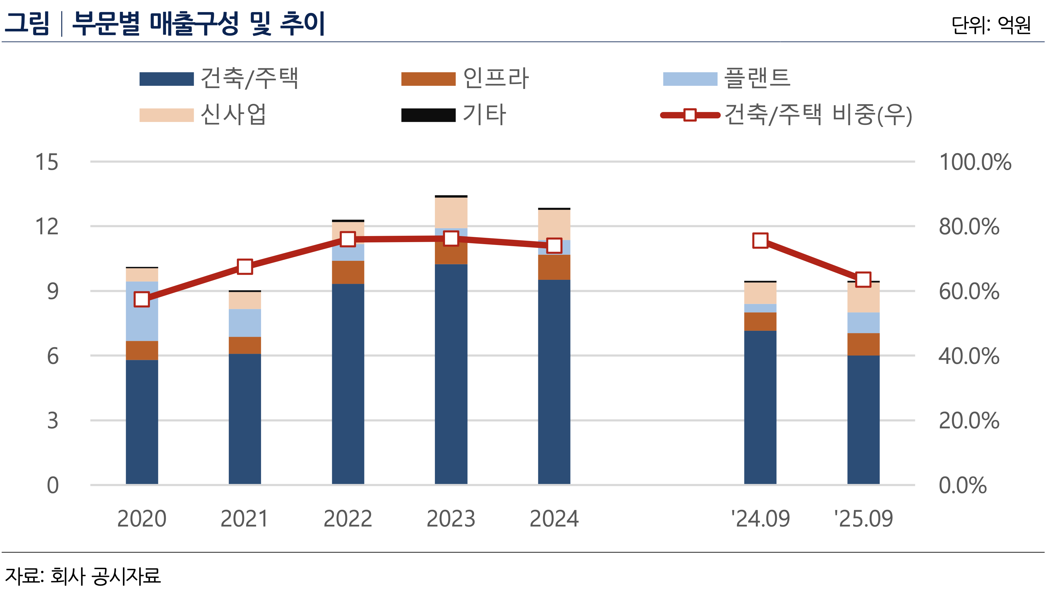 GS건설의 착공기준 수주잔고는 18조5497억원(올해 3분기 기준)으로 이 중 주택 수주 비중이 62.7%(11조5507억원)을 차지한다. 우수한 주택 사업 실적 등을 고려하면 향후 높은 매출 비중이 유지될 수 있을 전망이다. 아울러 아직 착공하지 않은 수주 물량과 GS이니마의 신사업 장기계약까지 반영한 수주잔고는 64조6404억원에 달한다.