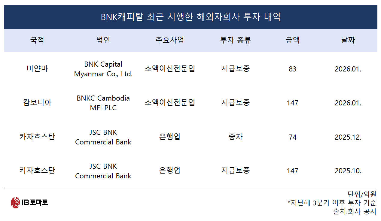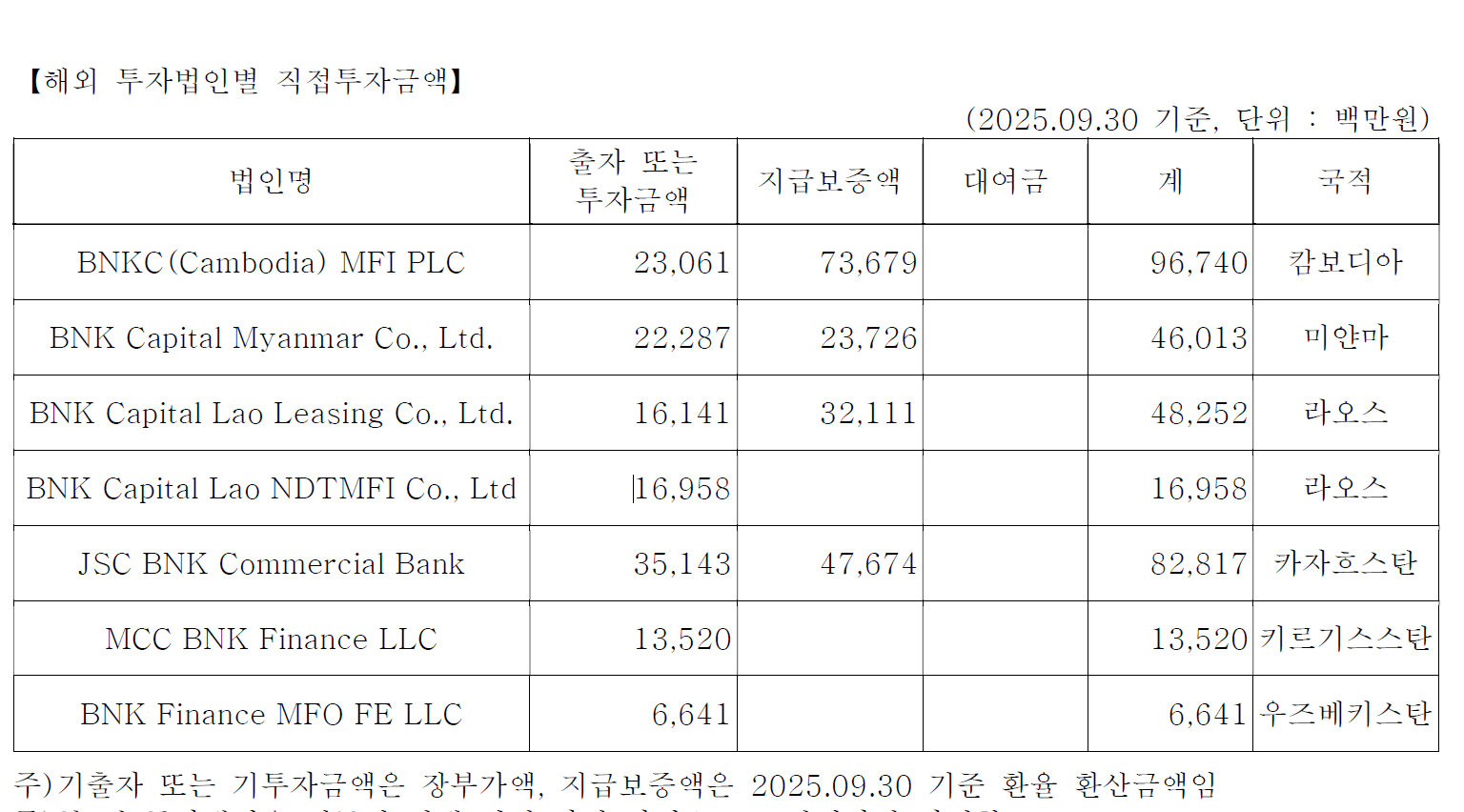 지난해 3분기까지 해외법인에 투자한 합계 금액은 출자금이 총 1338억원이며, 지급보증액은 총 1772억원이다. BNK캐피탈의 자기자본(1조5006억원)이나 당기순이익(2024년 기준 1176억원) 수준을 고려하면 투자 부담이 크지 않다.