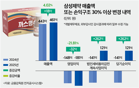 삼성제약 관계자는 <IB토마토>와의 인터뷰를 통해 "지난해 외주 영업 수수료 구조로 인해 이익률이 저조했던 영향이 있고, 재고자산 평가 등 일시적인 요인이 반영되면서 손실이 증가해 전년 대비 손실 규모가 확대됐다"며 "현재 해당 수수료 구조의 수익성 개선을 목표로 단계적으로 구조를 개선해 나가고 있다"고 전했다.