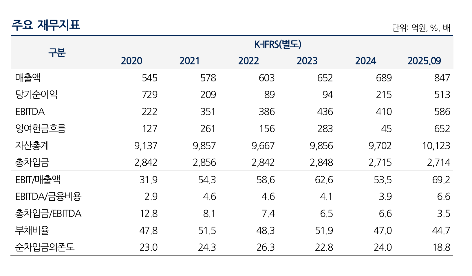 지주사 자체 실적도 개선되는 흐름이다. 지난해 9월 누적 별도 기준 매출은 847억원, EBITDA는 586억원을 기록했다. 같은 기간 총차입금/EVITDA는 3.5배로 전년 대비 하락했고 부채비율은 44.7%, 순차입금의존도는 18.8%로 안정적인 수준을 유지했다.