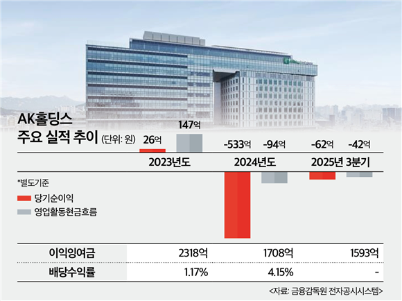 AK홀딩스의 별도 기준 당기순이익은 2023년 26억원에서 2024년 마이너스(-)533억원으로 적자 전환한 데 이어 지난해 3분기에는 -62억원을 기록했다. 같은 기간 영업활동현금흐름도 147억원에서 -42억원으로 감소하며 현금창출력이 크게 약화됐다.