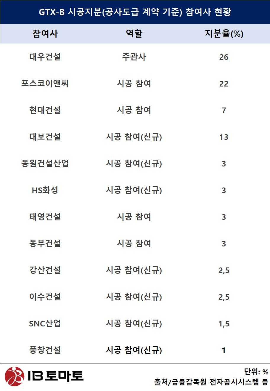 효성중공업(298040) 건설부문·HS화성·강산건설 등 중견·중소 건설사가 메우는 방향으로 재정비됐고, 이 과정에서 대우건설의 시공지분은 기존 22%에서 26%로 확대됐다. GTX-B는 시행법인 출자지분과 시공지분이 혼용되는 구조지만, 시공지분 기준으로 보면 대표사의 역할과 책임 범위가 동시에 커진 셈이다.