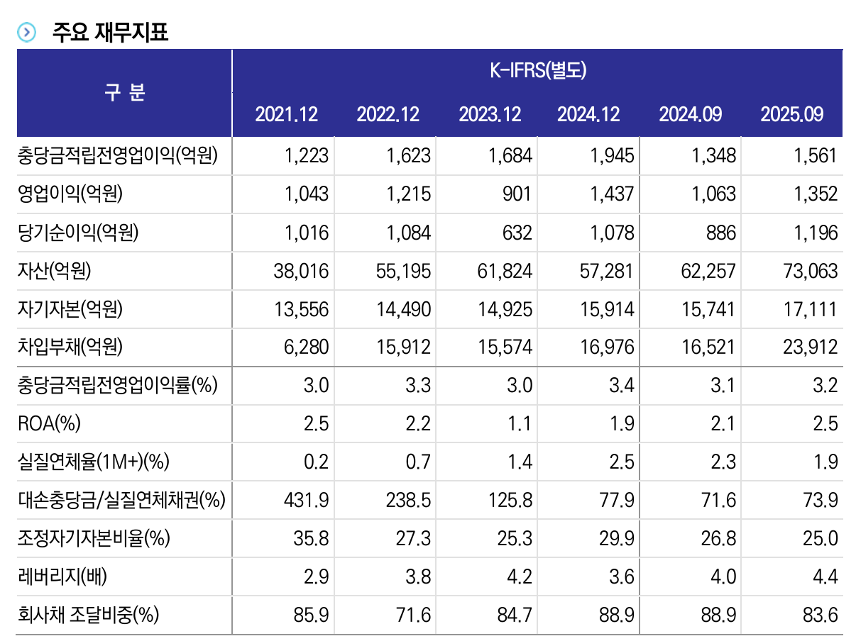 특히 대출자산 증가에 따른 대손비용 확대와 차입 증가에 따른 이자부담 상승으로 이익 하방 압력이 지속되는 상황이다. 2025년 3분기 누적 기준 영업이익과 순이익은 각각 1352억원, 1196억원으로 전년 대비 27.2%, 35.0% 증가했지만, 이는 비용 효율화와 계열사 배당(204억원), 파생상품 평가이익 증가 등 일회성 요인의 영향도 반영된 것으로 평가된다.